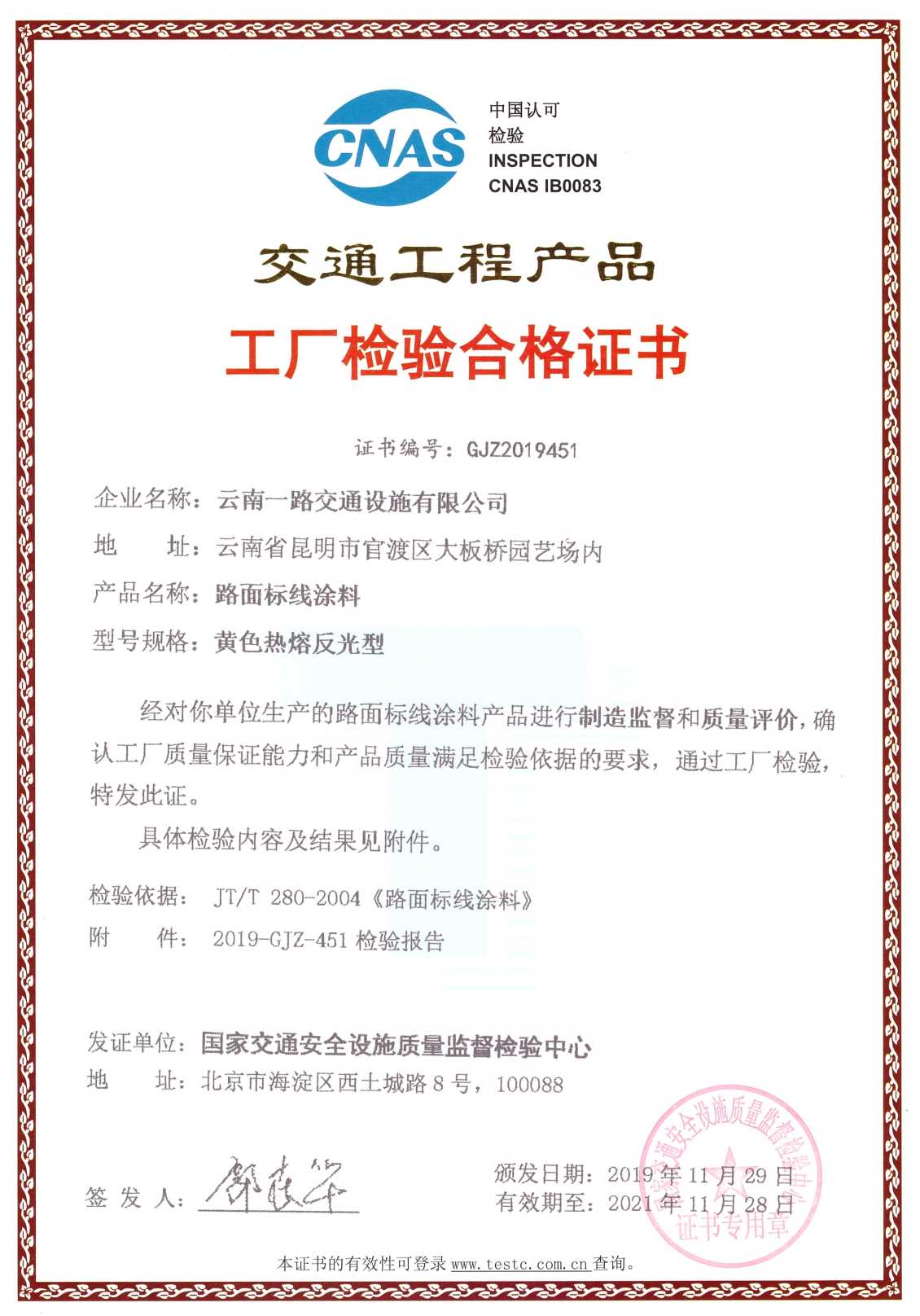白色热熔反光型路面标线涂料合格证书